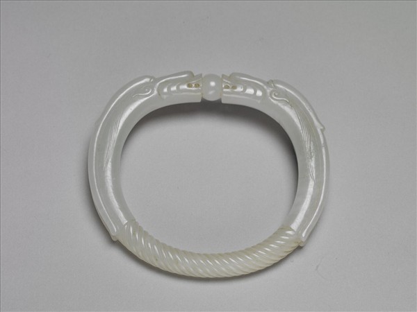 白玉鐲,玉色白,外壁雕二螭虎為飾,螭虎兩首相望,中以寶珠相接,螭虎角長而顯眼。螭虎身、尾處雕為以絞絲紋,如金屬條絞絲而成,頗具設計感。本器一式兩件成對。(故玉7901~7902)