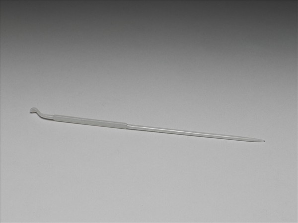 玉素挺簪,玉質瑩潤。簪身光素無紋,簪首處較粗,如套一管狀物包覆簪挺之狀,簪首末端又衍出一耳挖。附黃籤,黃籤上墨書:「白玉耳挖一支九百四十二號 」。