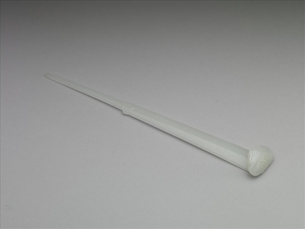 玉豆瓣簪,簪首為雲頭形,以陰線刻出如意雲紋及花瓣紋,簪首底部也以陰線刻出一如意雲紋;素挺,簪背為平面;色白純淨無雜質,經打磨呈現圓潤光澤;此器與故玉7994為一對,同儲一木盒。