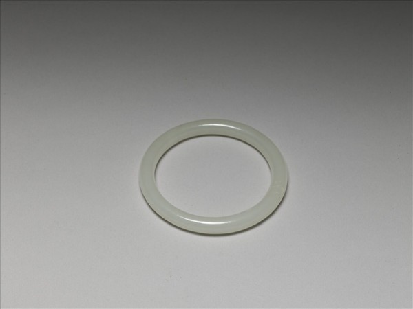 環形器,玉質,色白純淨,鐲身經打磨呈現圓潤光澤,無紋,此器與故玉7956為一對。