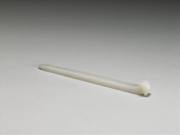 方柱簪,白玉質,簪首微彎,頂部呈鈕蓋狀,全簪無紋,尖素挺,色澤淨白飽滿。