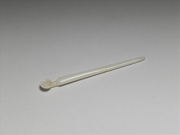 耳挖簪,玉質,往尾部漸收,簪頂為一扁圓,圓上又陰刻一圓,簪首下及簪身均有短陰線刻兩道,質地白淨。