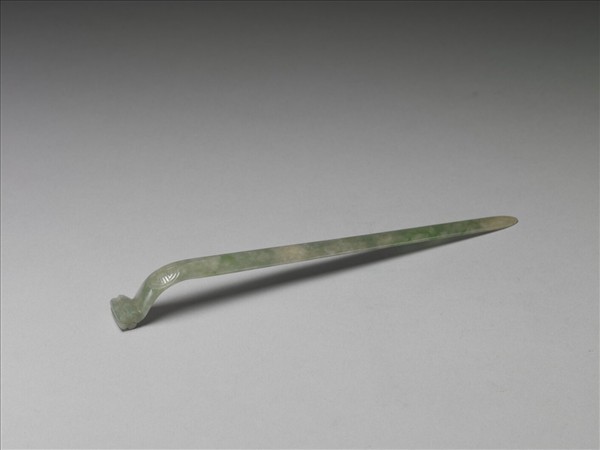 翠玉,青綠與褐色相互揉雜。簪頂雕立體梅花,彎處陰刻團壽紋。
