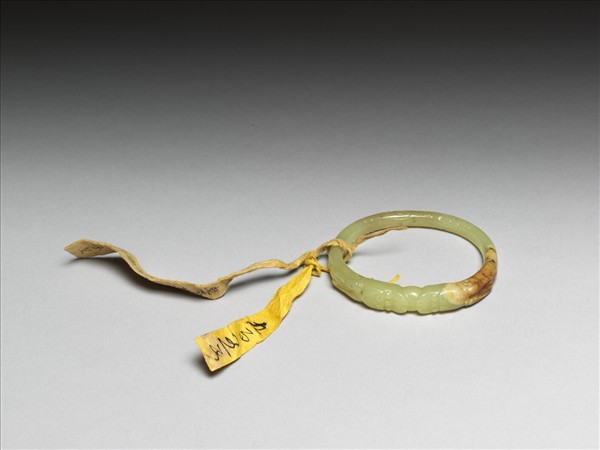 玉質,鐲身色青綠,部分沁出乳白與紅褐色塊,作雙龍搶珠狀。