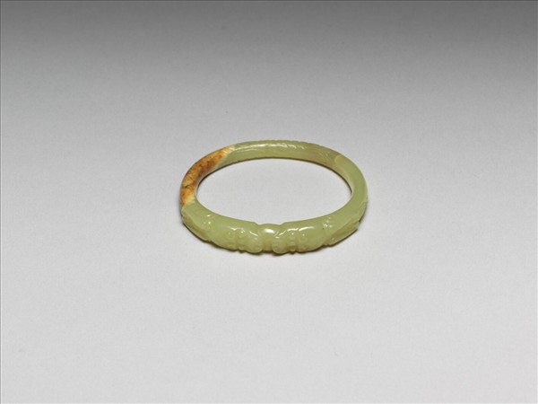 玉質,鐲身色青綠,部分沁出乳白與紅褐色塊,作雙龍搶珠狀。