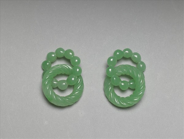 翠玉,每件以雙環組成,雙環間皆完整無接合痕,一環雕成絞絲紋、另一為連珠紋,色澤光亮瑩潤。