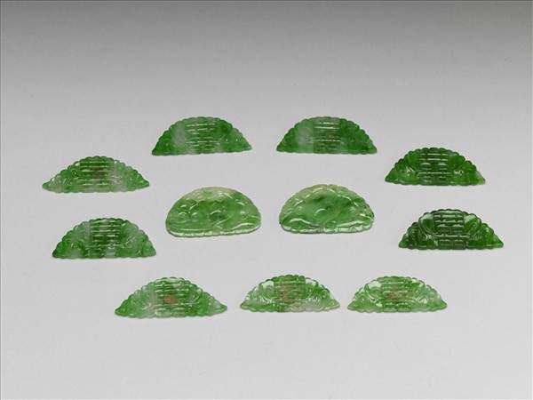 翡翠,共十一件(故玉8002-8012)。其中九件雕一「囍」字,兩側雕綬帶;其餘兩件雕飾 弧線與小渦卷,既如伸展的葉片,又似振翅的蛾蝶。