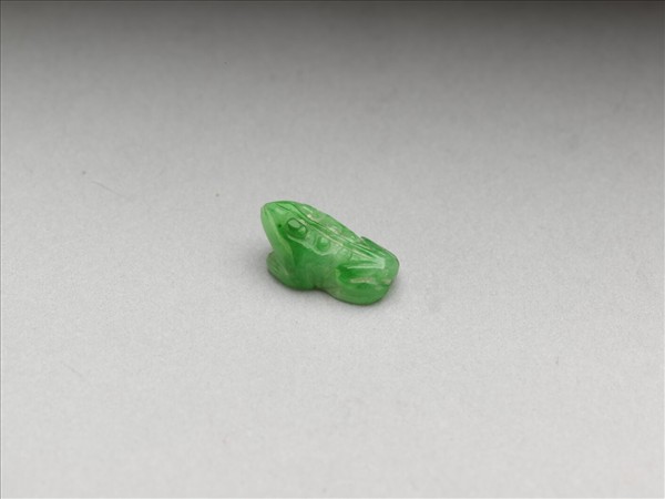 翠玉小蟾,玉色翠綠而間見白斑。整器雕為伏地昂首的小蟾,粗而肯定的陰線修飾出蟾的脊線與腿部,還以浮雕的圓點示意蟾眼與外表的斑紋,技法簡單卻表現出小蟾栩栩如生的可愛模樣。