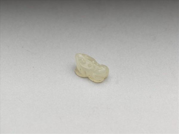白玉小蟾,玉色白。整器雕為伏地昂首的小蟾,浮雕的圓點示意蟾眼與外表的斑紋,並以陰線修飾出蟾的脊線與腿部,加上打磨出瑩潤的質感,甚是可愛。