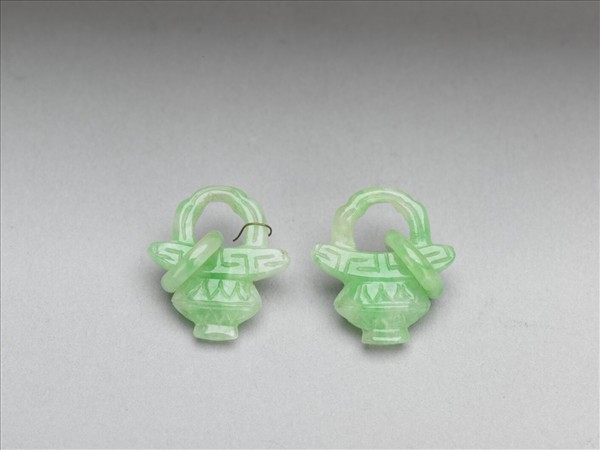 綠玉片狀飾件一對,淺綠色,整器雕為一盤口碩腹的花籃,花籃腹外壁雕飾簡單的連續三角紋,口緣雕飾回紋,提樑略近半圓,並見一環相繫。本器當為墜角,作為製作其他器物時的配件。