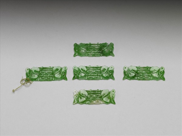 翠玉片狀飾件,全器略成長方片狀,並雕為中央「囍」字、兩側岐出彩帶的對稱樣式。彩帶雖刻意雕琢為隨風飄動之狀,但為配合玉飾件的形狀,所以略乏自然飛動之勢,然利用彩帶飄動所造成的空間,雕鏤為通貫的孔洞,恰可穿繫、固定於他器上,成為製作其他器物的配件。