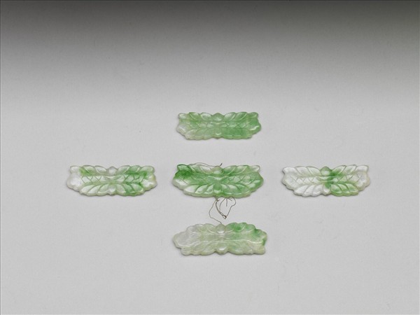 翠玉片狀飾件,玉色白綠相間,全器略成長方形,上下分琢為仰、覆蓮瓣,使成一朵側視盛開的蓮花。器側並有通心穿,恰可穿繫、固定於他器上,成為製作其他器物的配件。