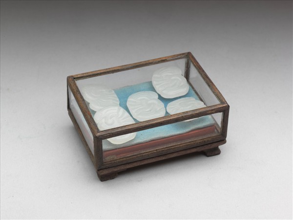 白玉鈕扣,略近弧角方形,以粗細不同的陰刻線,雕飾出一隻側首張翅,面上鑽有三處小孔,恰可穿繫、固定於他器上。本器一式五件,同儲於玻璃匣中。