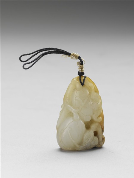 玉質,玉色白潤,局部帶橘色玉皮及黃斑。整器依籽料特徵琢成一大一小帶葉瓜果,一展翅蝙蝠棲於瓜面,底邊雕飾一隻揚尾松鼠,仰攀於藤葉之上。器上方繫黑縧緝米珠,米珠脫落不全。