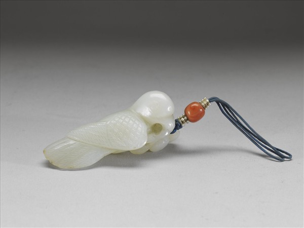 玉質,全器琢成銜枝鳥禽。以淺浮雕及陰刻表現鳥羽。喙下鏤雕折枝帶葉果實二粒。上繫藍縧結子,緝米珠,貫飾一粒珊瑚珠。以淺浮雕及陰刻表現鳥羽。喙下鏤雕折枝帶葉果實二粒,多處成穿。上繫藍縧結子,緝米珠,貫飾一粒珊瑚珠。