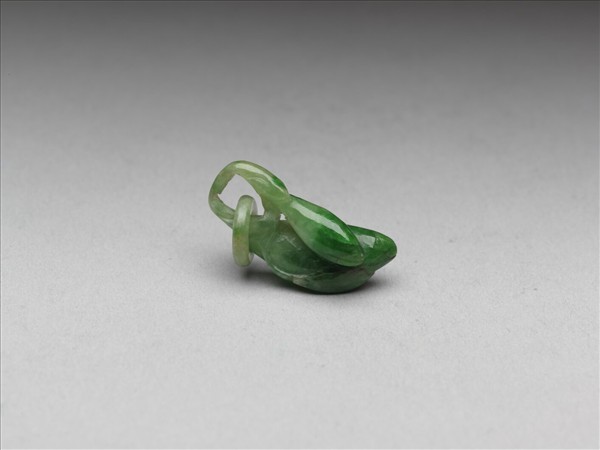 翠玉,全器為兩只大小不一的並蒂花苞。上方有一小圈以利穿繩。
