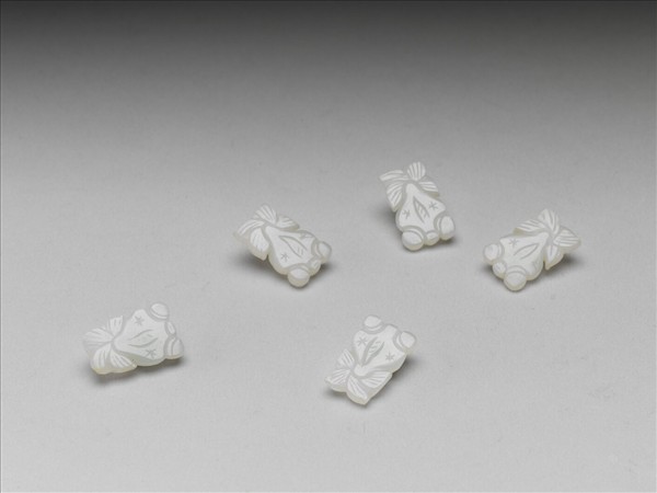 玉質,金魚造型,背面有一橋形鈕穿,中有孔眼以供穿線,共四枚。