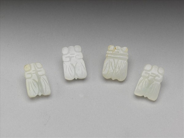 玉質,蟬造型。背面光素無紋,帶一橋形鈕穿,中有孔眼以供穿線。共四枚。