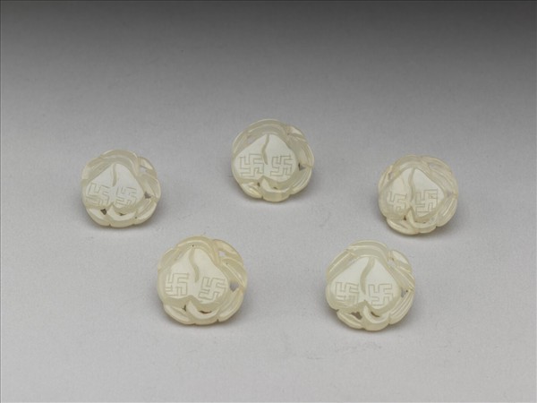 玉質,桃形,其上有兩卍字,象徵萬壽。背面有一橋形鈕穿,中有孔眼且穿有金屬環,共五枚。