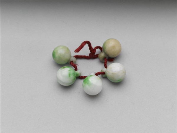 翠玉,鈕身呈球形,光素無紋;一側出鈕穿,以紅色絲繩繞過穿孔將五鈕串連在一起,便於存貯。