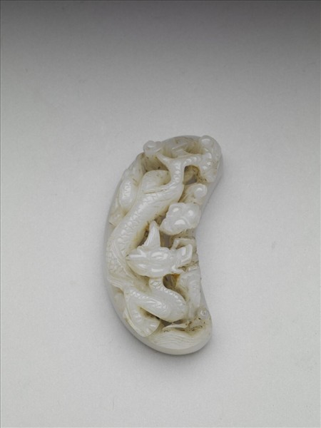 玉質,弦月形,有一盤龍,周圍滿飾雲紋。