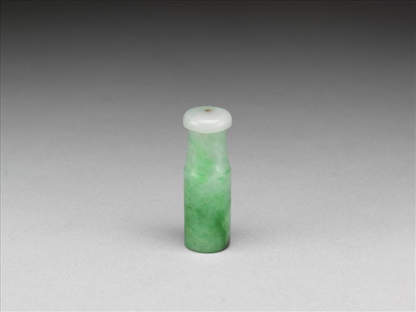 翠玉,外壁光素無紋。器身一段直筒狀,中空以容納煙管。另一段口沿處琢為圓餅狀,有穿直通筒狀器身,以就口吸煙。