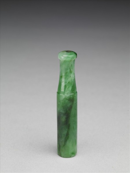 翠玉,外壁光素無紋。器身一段直筒狀,中空以容納煙管。另一段口沿處琢為圓餅狀,有穿直通筒狀器身,以就口吸煙。