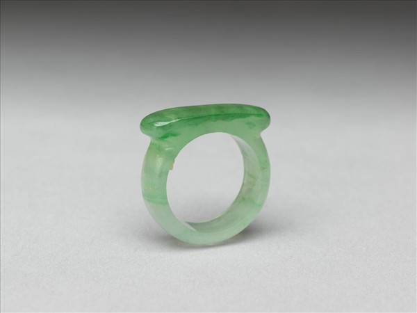 翠玉,馬鞍形,色澤翠綠清亮,整器無紋。