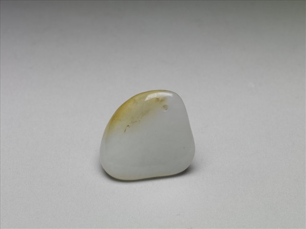 玉質,頂部穿孔可繫繩,泛青白色,帶一塊黃斑。
