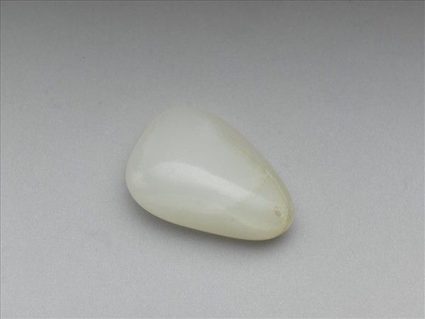 玉質,形狀近似墜子,頂部穿孔可繫繩,泛青色。