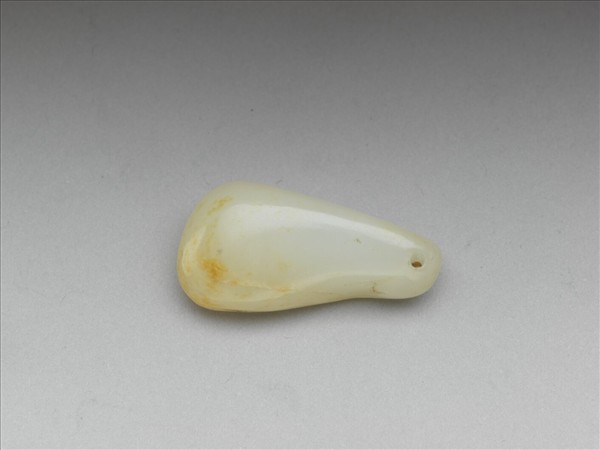 玉質,形狀近似墜子,頂部穿孔可繫繩,邊角泛黃色。