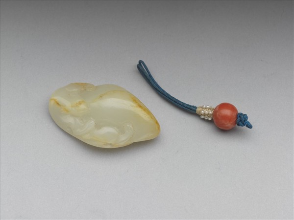 玉質,淺刻獾紋圖樣,頂部穿孔可繫繩,邊角泛黃色。另一珊瑚珠緝米珠藍色繩結。
