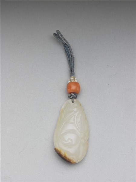玉墜,淺刻瓜果紋,底部帶黃褐斑紋。頂部穿孔以藍色繩結穿繫珊瑚珠緝米珠。