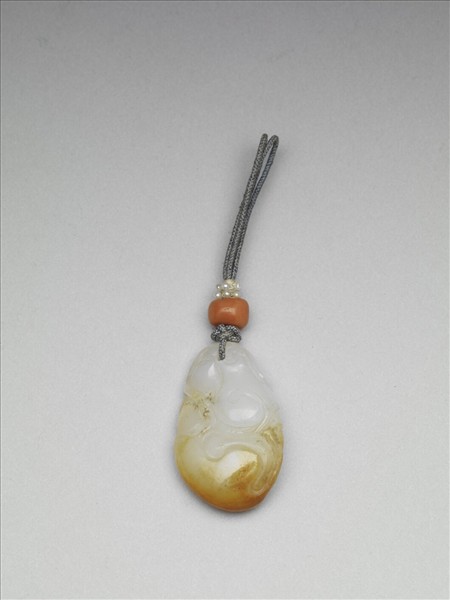 玉墜,淺刻瓜果紋,底部帶黃褐斑紋。頂部穿孔以藍色繩結穿繫珊瑚珠緝米珠。