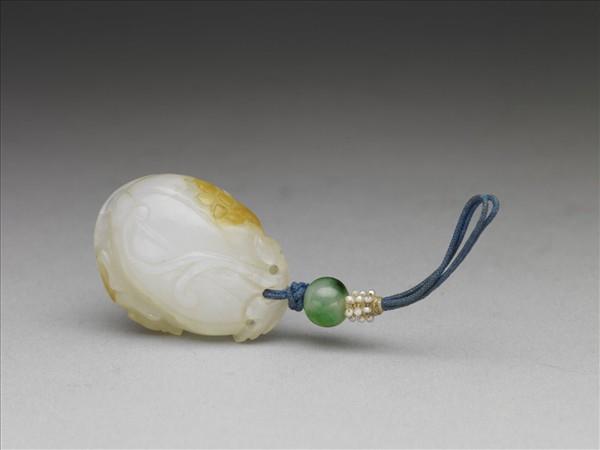 玉墜,青白通透中帶黃褐色澤,通體淺雕瓜瓞綿綿圖樣,精巧細緻,瓜葉交疊孔隙以藍色絲線穿繫,結一翠玉小珠和緝米珠。