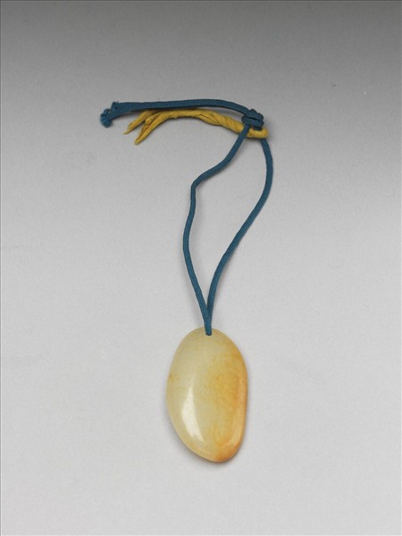 玉墜,瑩潔通透中泛黃,質地溫潤,以藍色絲線穿繫。