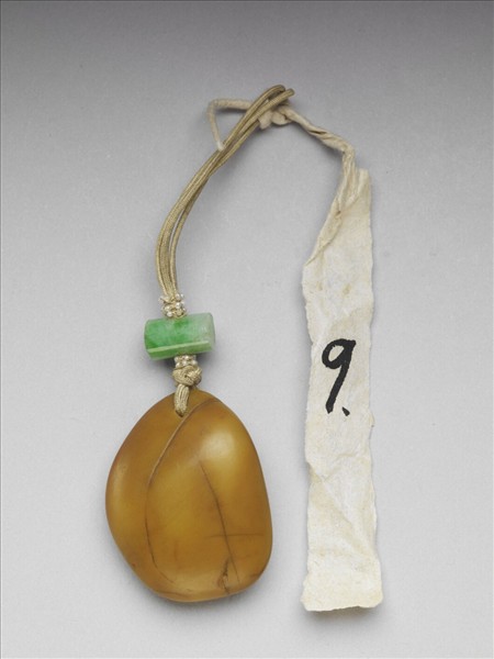 玉墜,色澤黃褐乳濁,質地溫潤。以黃色絲線穿繫,結一小塊翠玉,上下飾緝米珠。