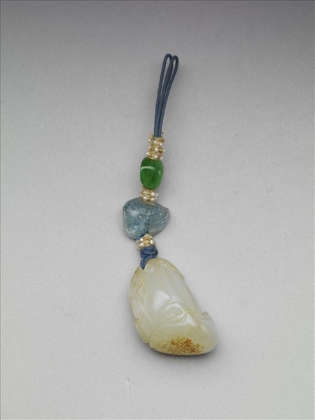 玉墜,青白通透中帶黃褐色澤,淺雕花紋,以藍色絲線穿繫,結一小塊翠玉和藍色碧璽,上下飾緝米珠。