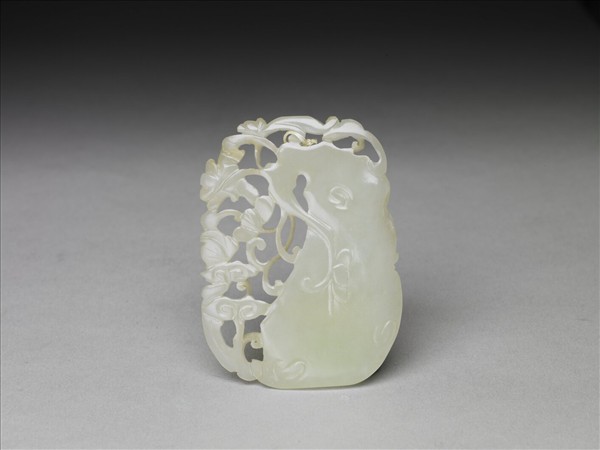 片形玉墜,青白通透,半邊透雕花草如意雲紋,花草紋蔓延至另外半邊,則以淺雕呈現,雕工精巧細緻。