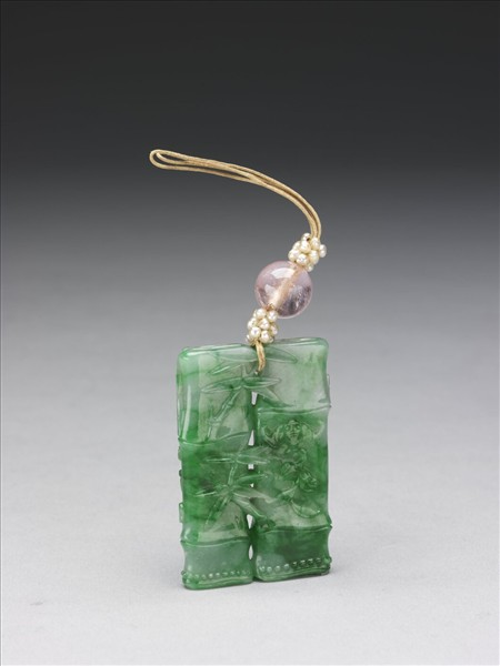 由整塊玉雕刻而成,玉質瑩潤,翠綠中帶白。玉佩約呈長方形片狀,鏤雕二段相連竹節,帶竹枝與竹葉;其中一段竹節雙面均飾有蝙蝠銜桃實,另一段竹節於其中一面加飾鳳鳥。黃縧繫於竹節間孔隙,穿粉紅色碧璽珠一顆及緝米珠二小組。