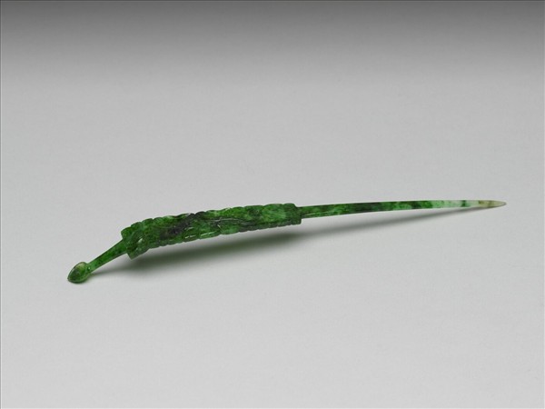翠玉雕刻而成耳挖簪一支,挺扁平而細長,簪首約呈長方形片狀,飾荷花與荷葉;簪首頂部微曲,出一小勺,可作耳挖。耳挖簪插在髮際,方便隨時拿取,兼具裝飾與實用功能。