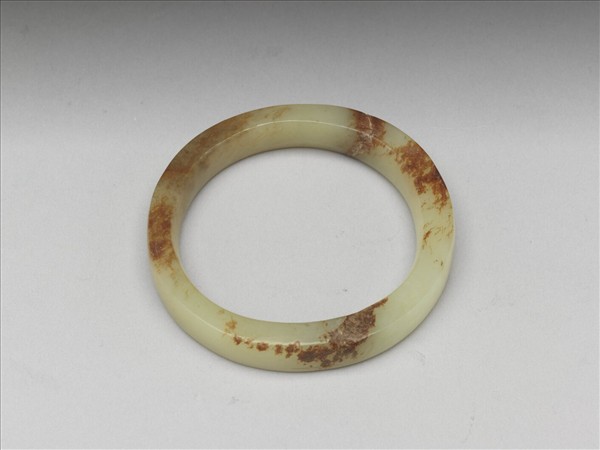 手鐲,玉質溫潤,色青白,受沁染而局部帶褐斑,有璺。全器呈環形,器內外壁打磨平滑,光素無紋飾。
