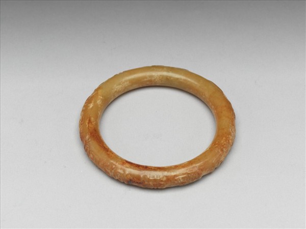 手鐲,玉質溫潤,受沁染而多為赭色,有璺。全器呈環形,器壁打磨為圓弧,外緣繞一圈篆文。