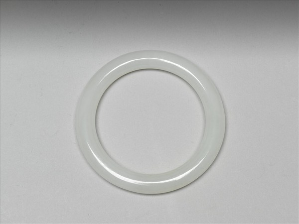 整塊白玉雕刻而成之手鐲,玉質瑩潤純淨。全器呈環形,器壁打磨圓滑,光素無紋飾。