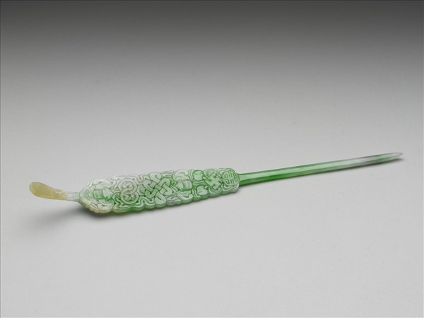 翠玉簪,簪頂為耳挖,簪首雙面皆雕有蝠紋、雙錢紋、盤長、桃實與卍字紋,象徵福壽綿長,細長鋌。色青綠微沁白。