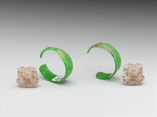 耳環,由翠玉環及雕雙喜碧璽墜角組成,綠玉色深沁白,碧璽色較暗,微透光。此件與故玉8676為一對。