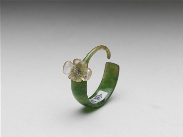 翠玉耳鈎式耳環,於鈎頂貼飾一雕碧璽四瓣花卉,綠玉色偏灰,沁有褐斑,碧璽粉紅透明。此件與故物8679為一對。