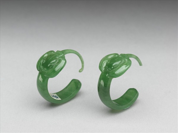 翠玉耳鈎式耳環,於鈎頂淺浮雕一蝠紋,色澤鮮綠。此件與故玉8681為一對。