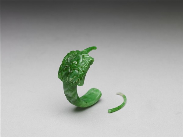 翠玉耳鈎式耳環,於環上淺浮雕桃實,綠玉沁白。此件與故玉8688為一對。