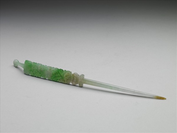 翠玉耳挖簪,器身帶有些許弧度,簪頂為耳挖,簪首陰刻一長形花籃,細尖鋌;器身泛白,唯簪首帶少許翠綠色。